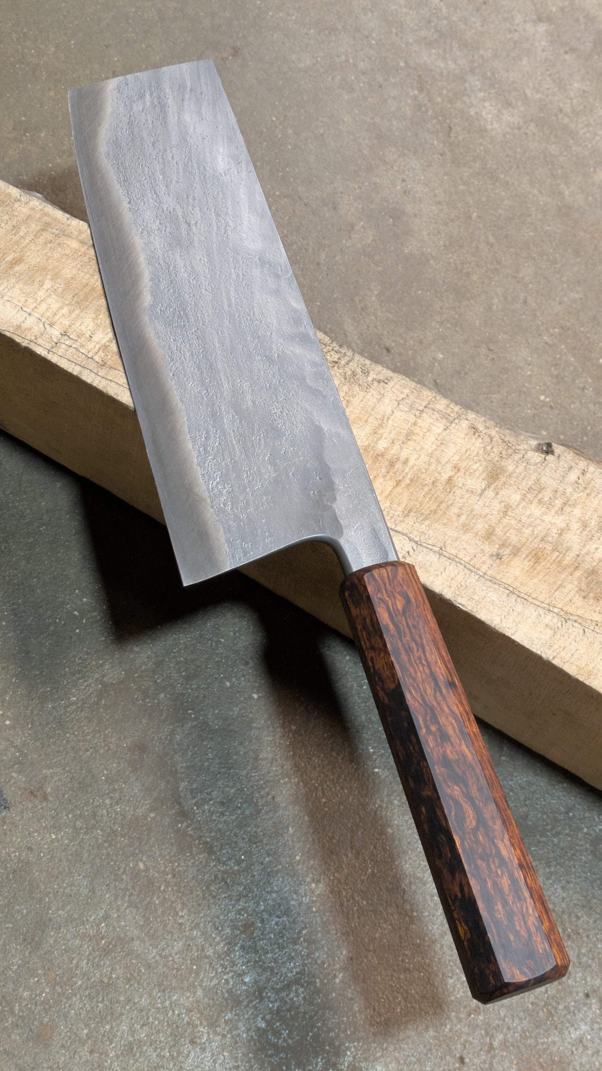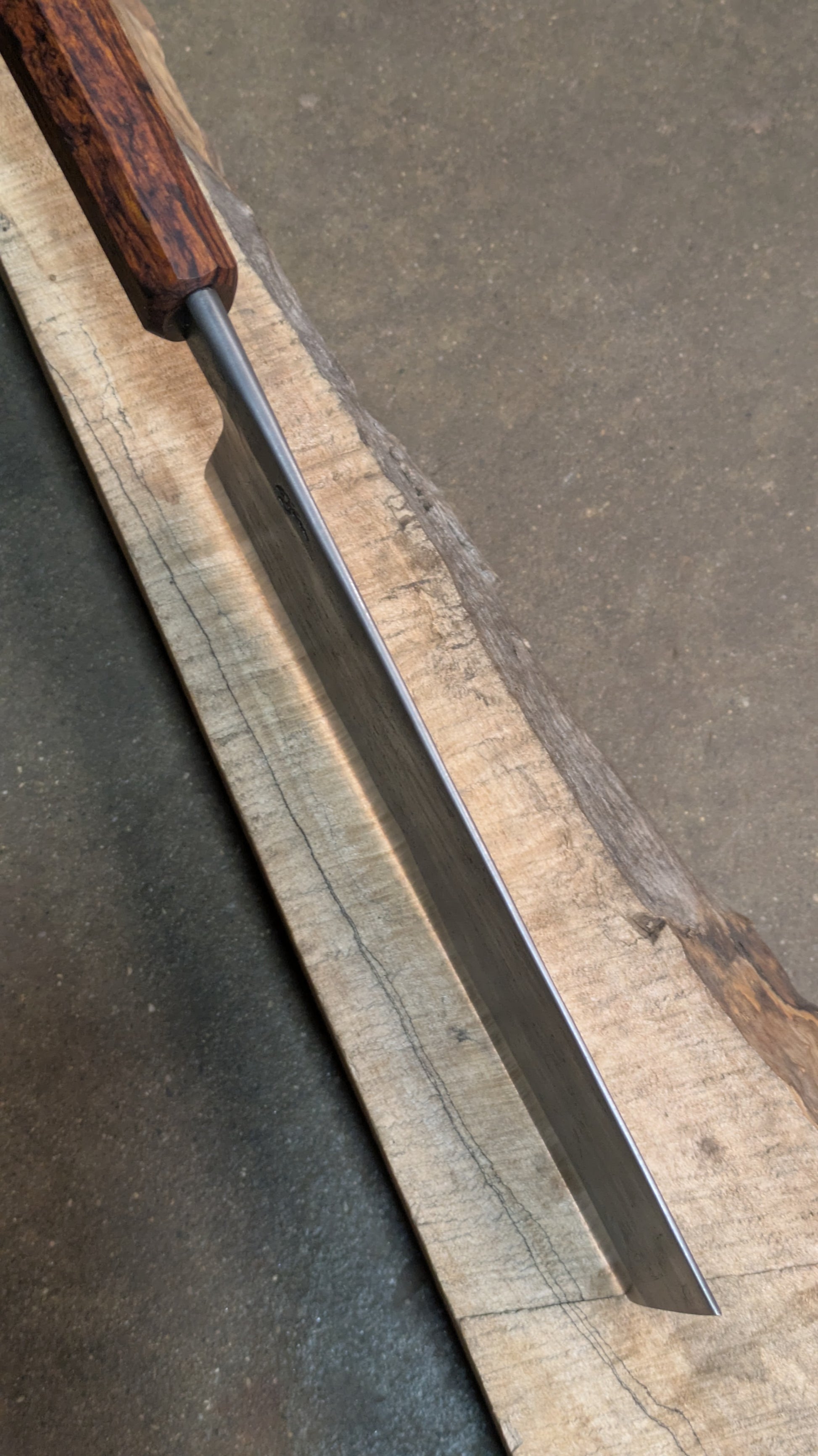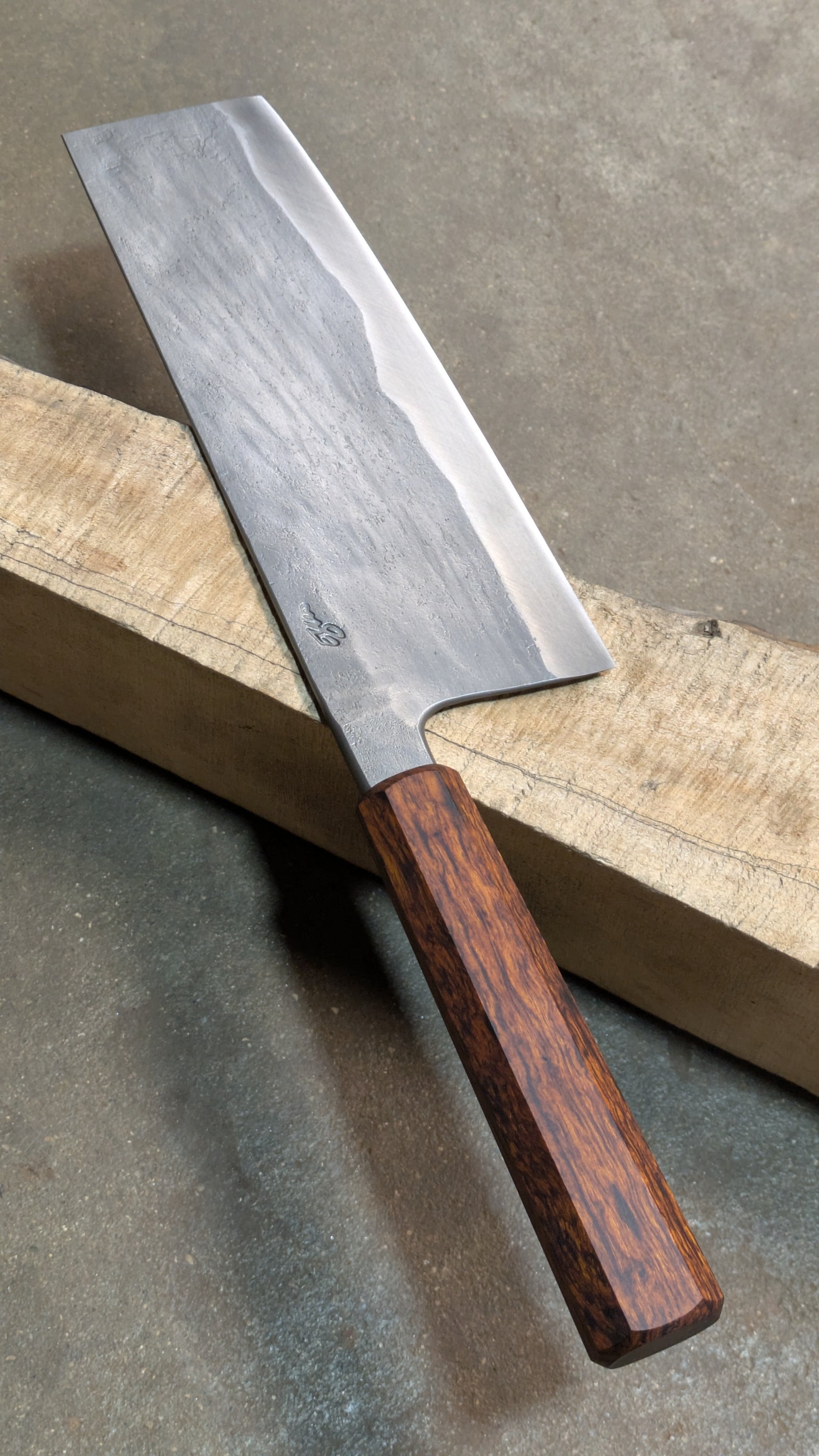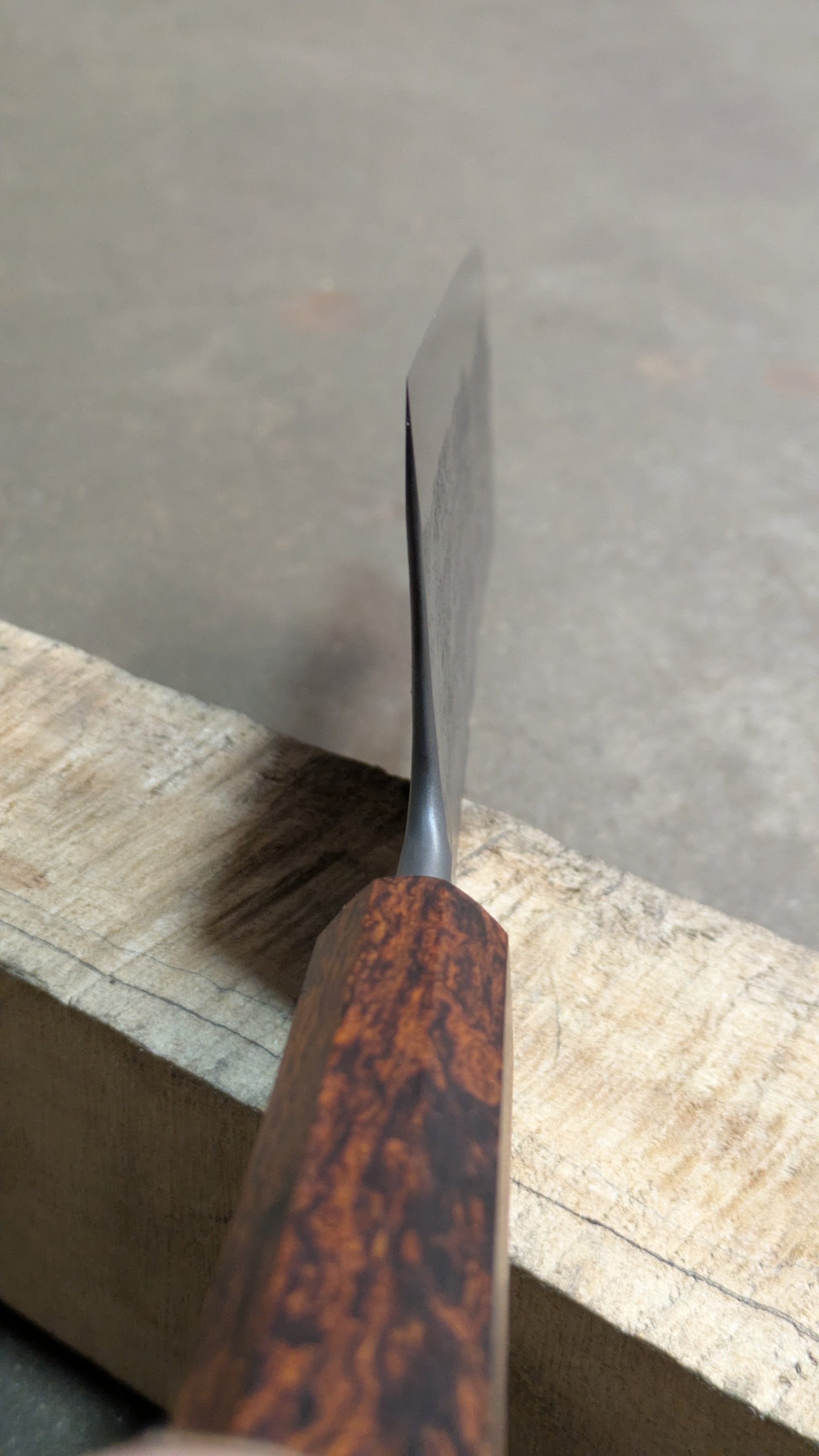 My personal favorite knife recipe, ready to get to work. Mono AU forged geometry for low bevels, ground extremely thin behind the edge, brushed etch finish, and a mono Ironwood Wa handle.