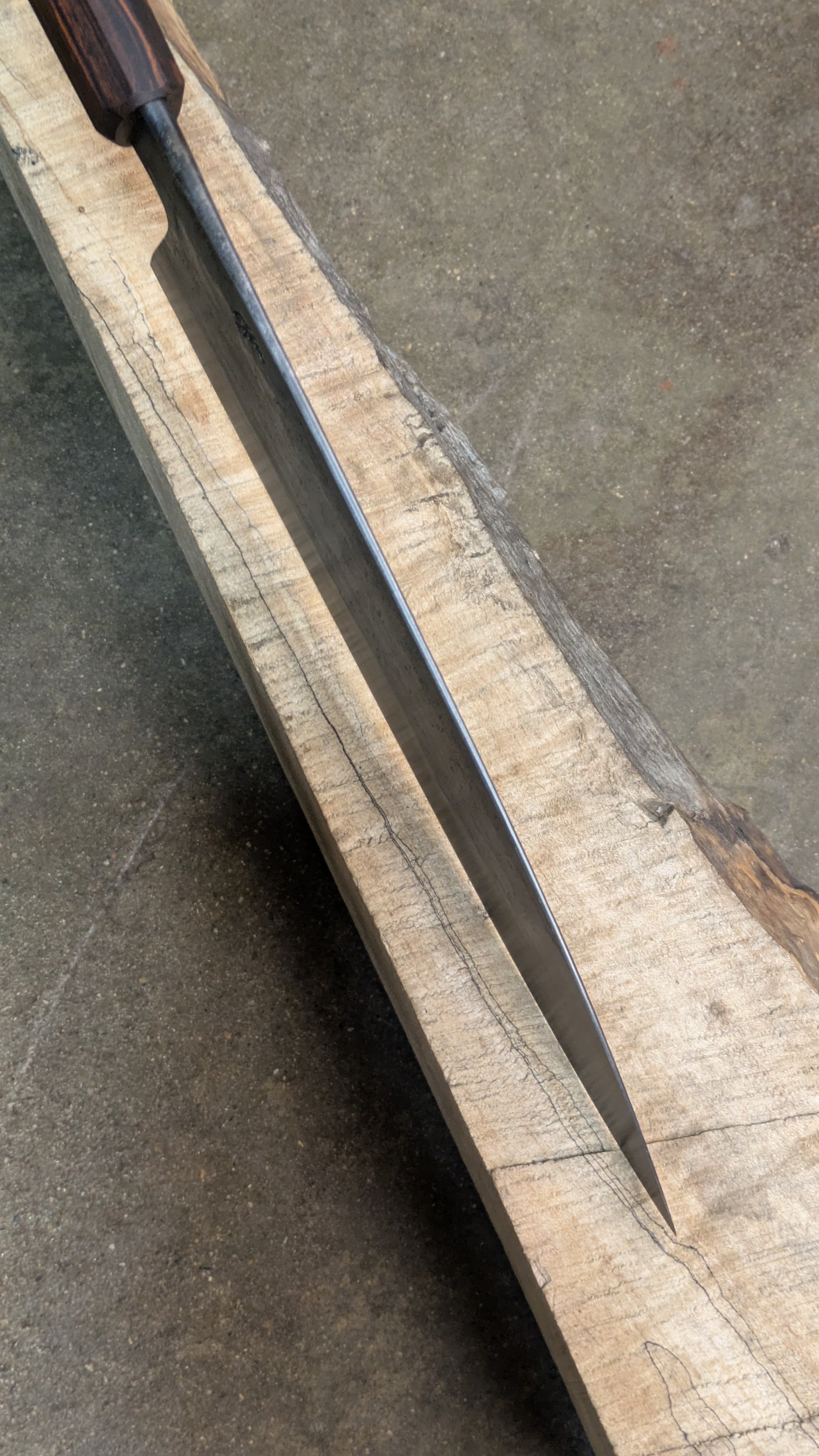 Mid-weight convex grind, with a mild forged S. Comes with leather sheath and wax tube.